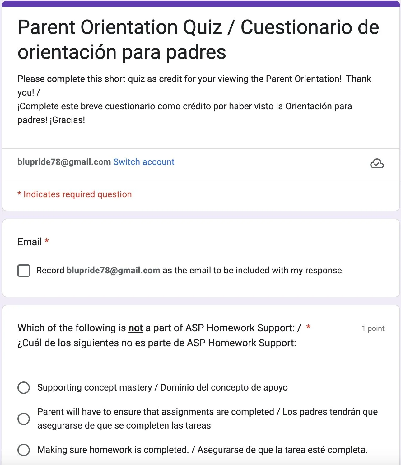 Gracias por cumplir con nuestra necesidad de participación de los padres. Haga clic en las imágenes para ver una orientación grabada, leer las diapositivas de la presentación y realizar el cuestionario obligatorio.